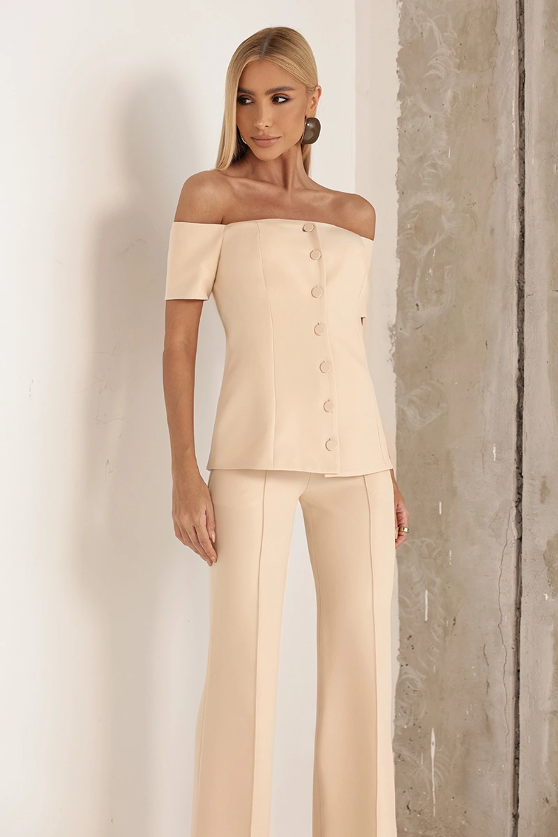 Conjunto blusa ombro a ombro com decote reto, mangas médias, fechamento frontal por botão forrado. Calça cintura alta reta, possui bolsos laterias funcionais, detalhes de nervuras, possui forro interno.
